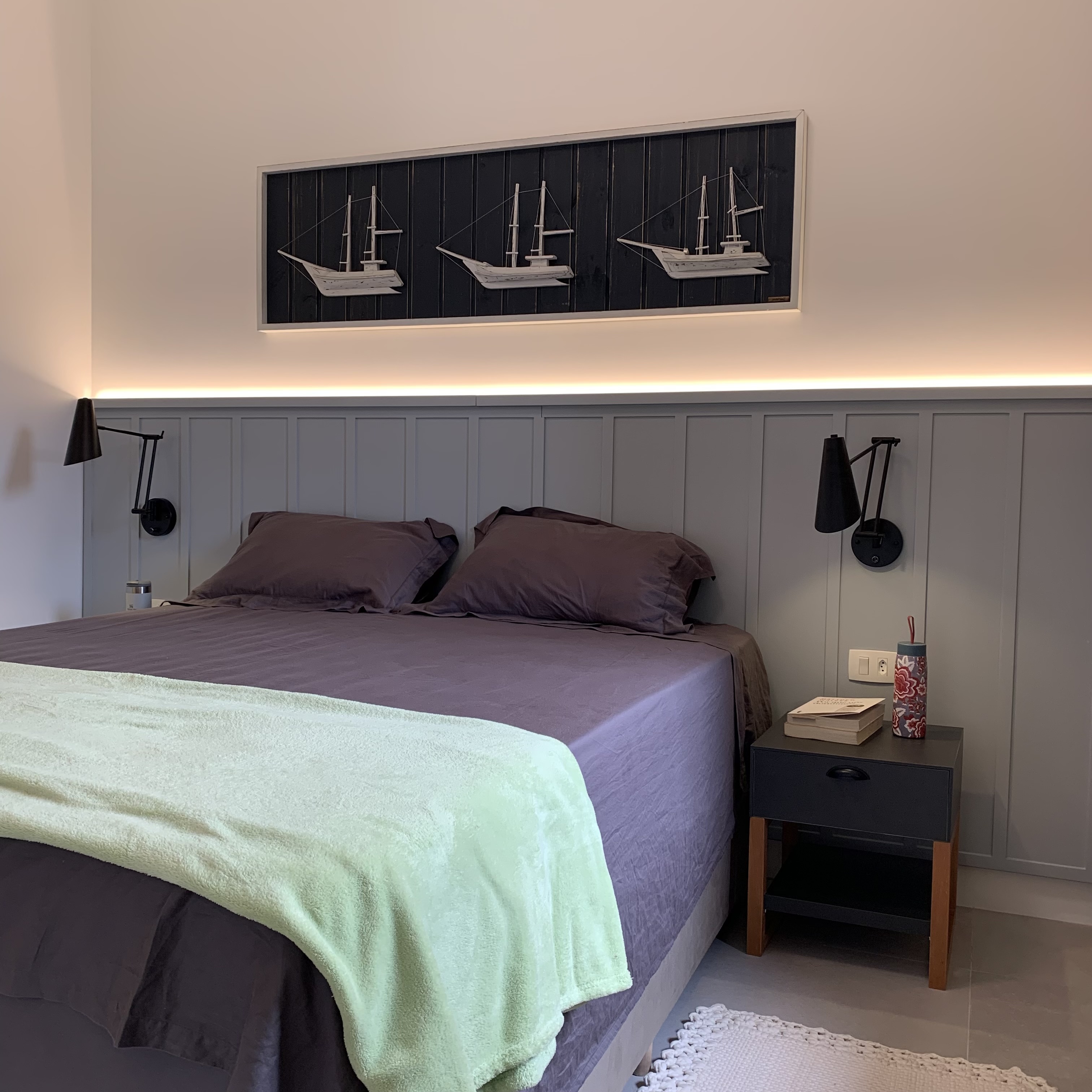 O conceito adotado privilegia tons claros e leveza, com uma cozinha mais integrada para maximizar a sensação de amplitude. A concepção do projeto buscou harmonizar a demanda por diversos equipamentos de cozinha e soluções de armazenamento. Para os armários dos quartos, devido ao espaço limitado e à umidade inerente ao ambiente praiano, optou-se por telas perfuradas, garantindo ventilação e durabilidade.