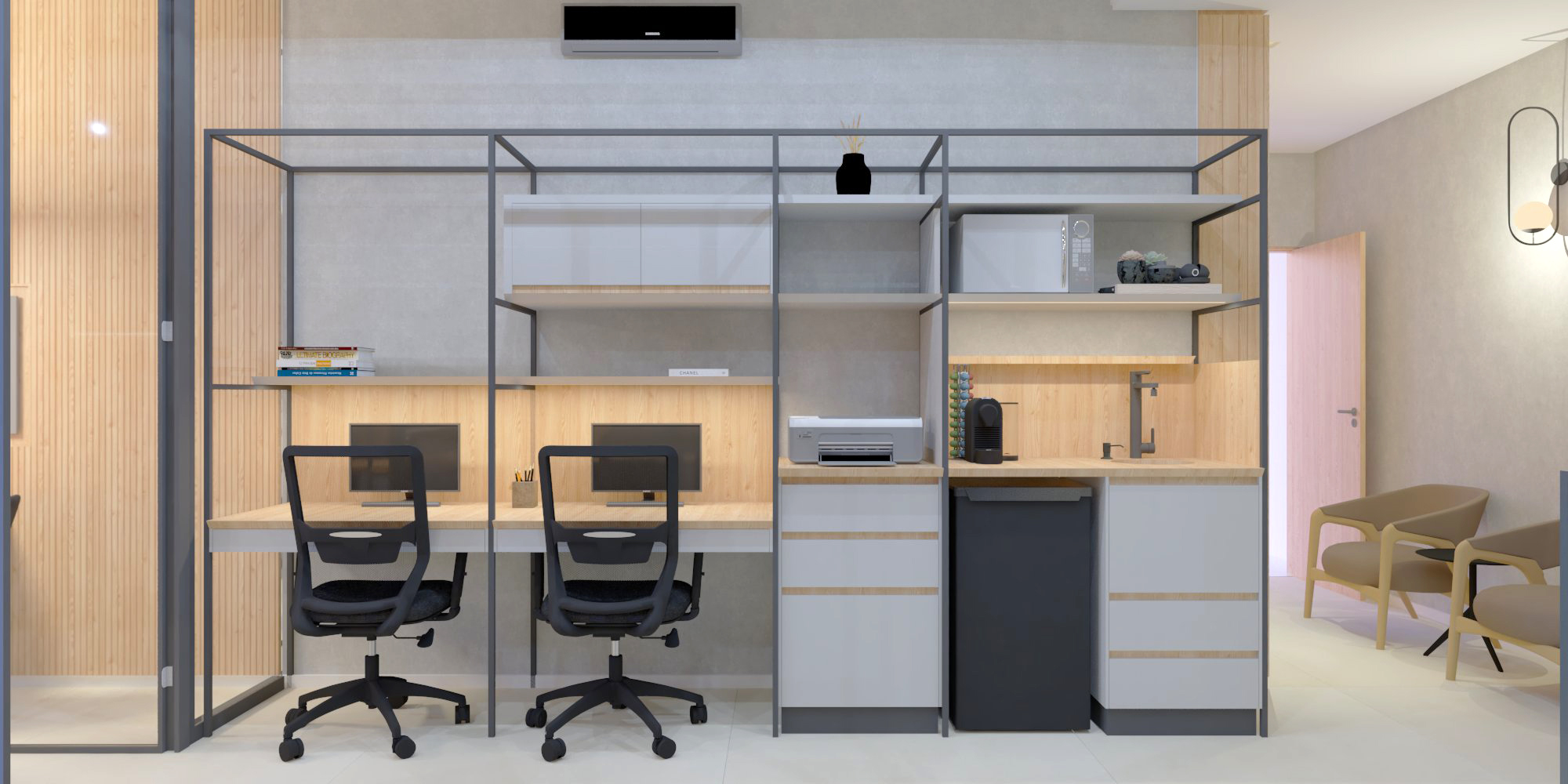 almoxarifado e 2 estacoes de trabalho de forma harmônica em um mesmo móvel.