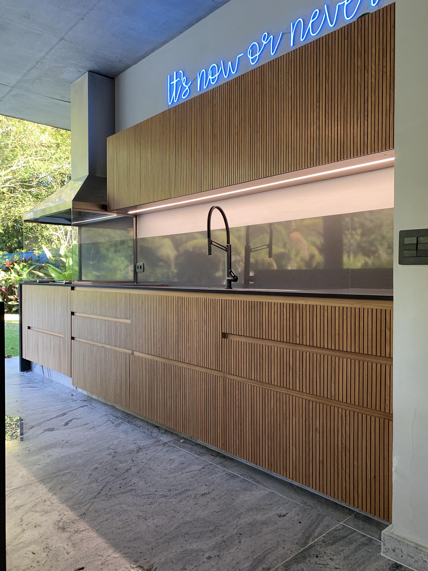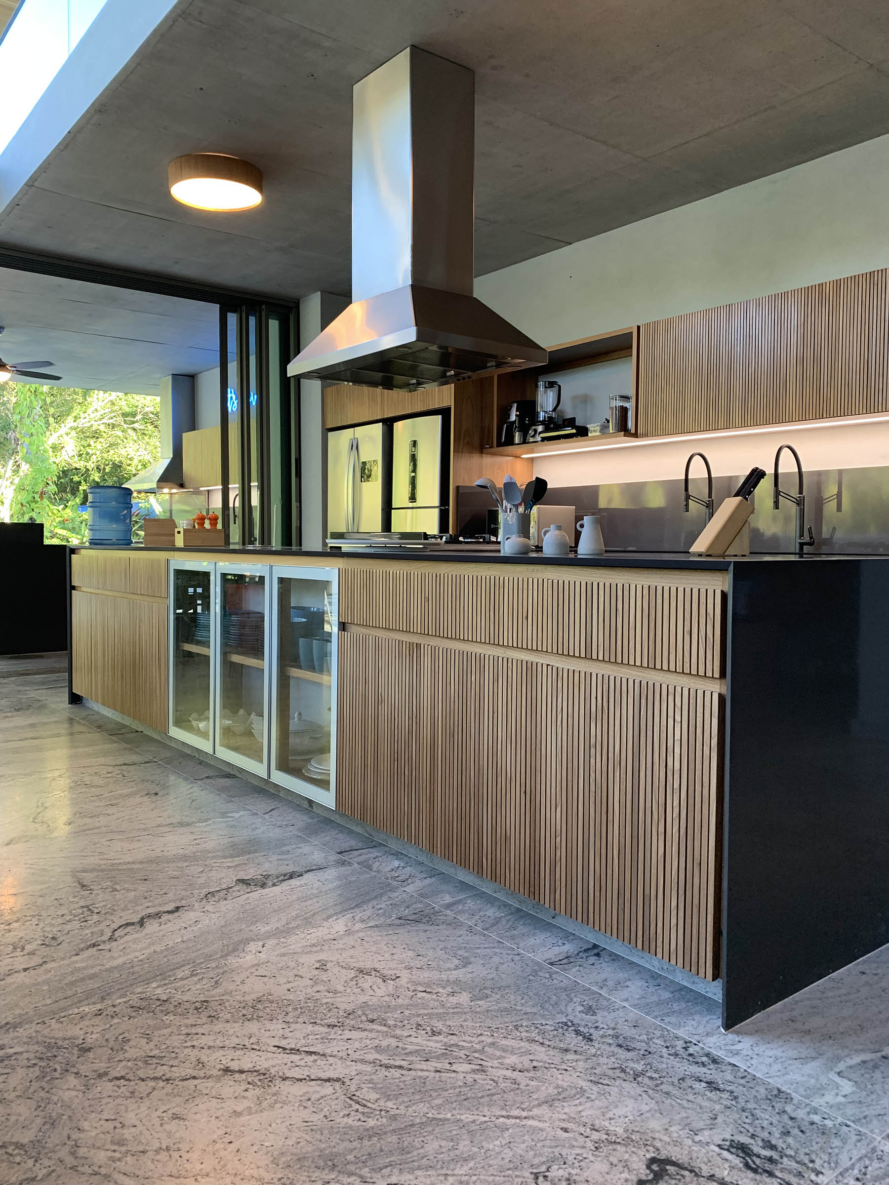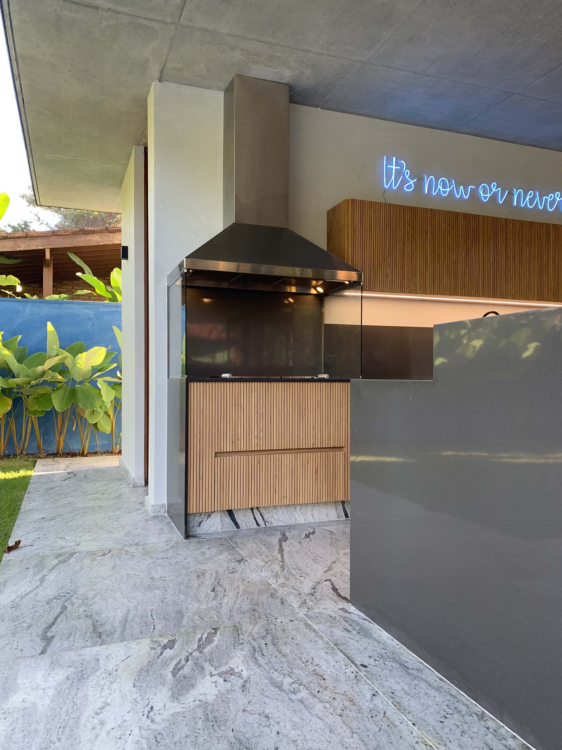 A integração entre a cozinha interna e externa é um pilar do projeto, otimizando a experiência de uso e a fluidez entre os ambientes. Essa conexão proporciona versatilidade e amplifica as possibilidades de lazer e convívio.