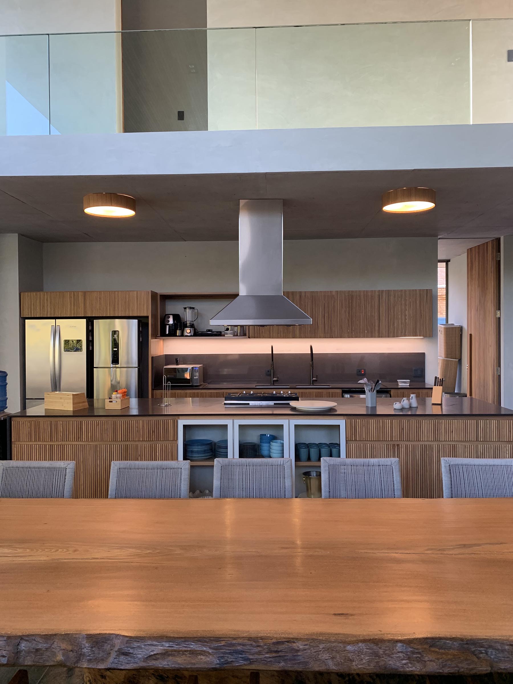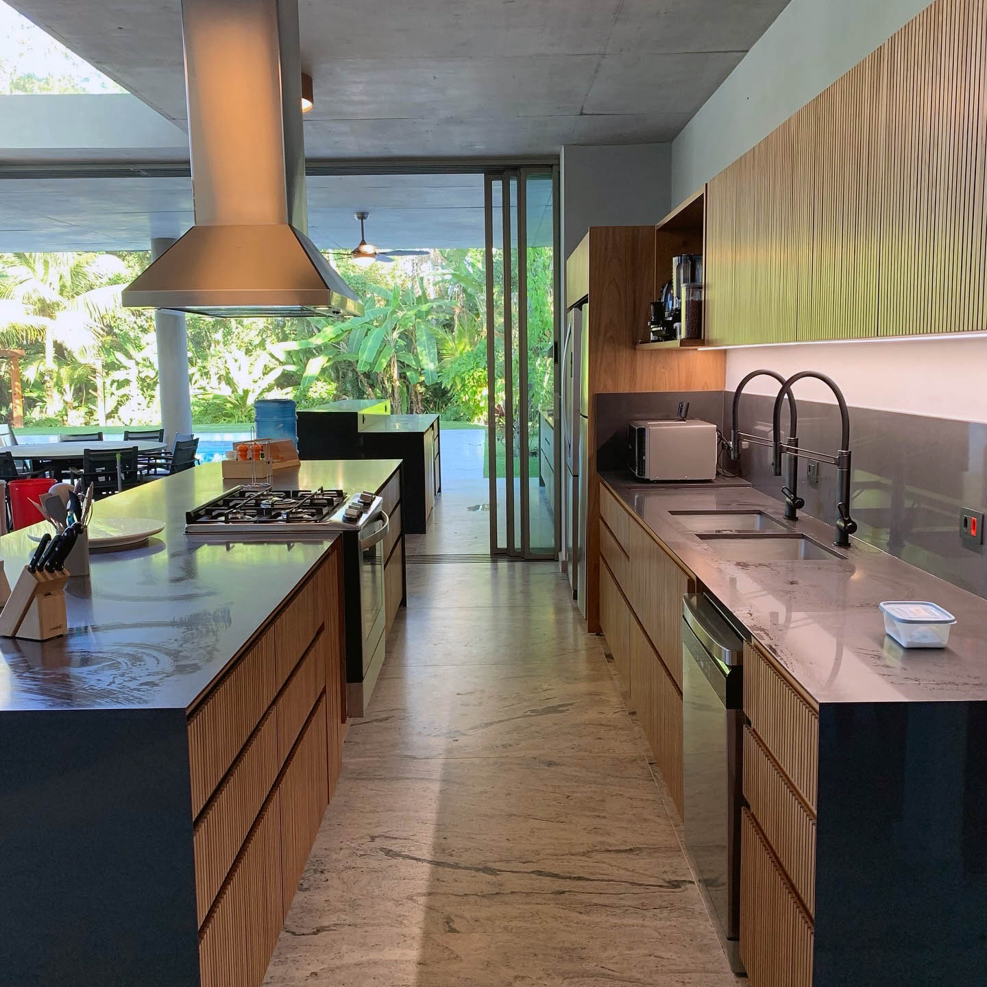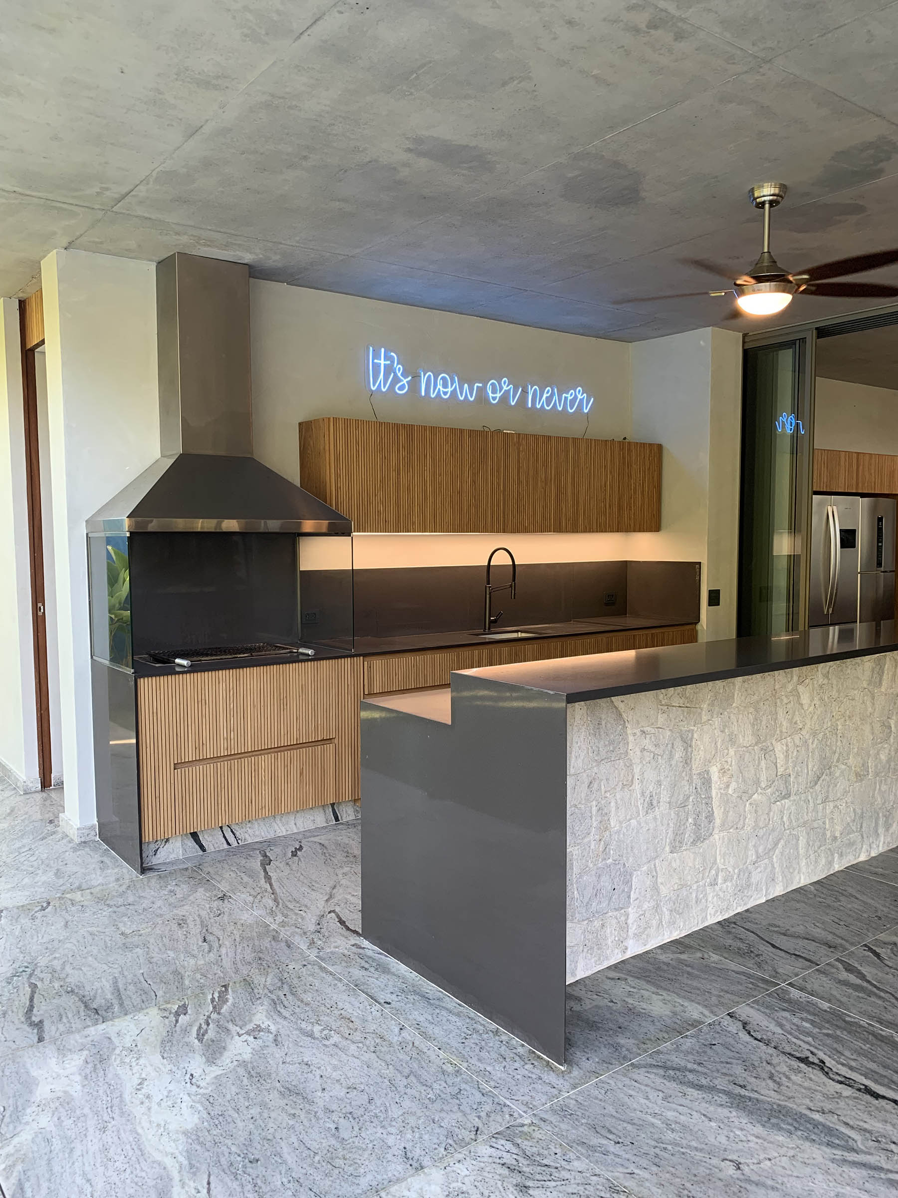 A integração entre a cozinha interna e externa é um pilar do projeto, otimizando a experiência de uso e a fluidez entre os ambientes. Essa conexão proporciona versatilidade e amplifica as possibilidades de lazer e convívio.