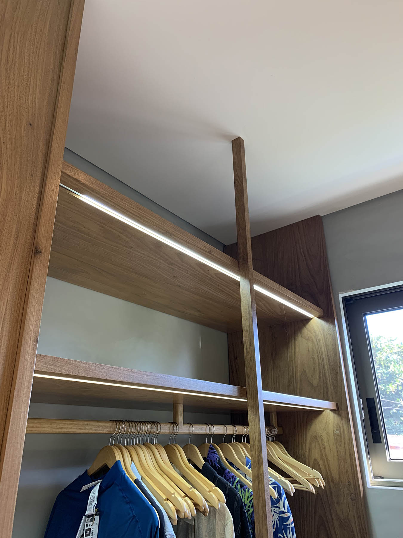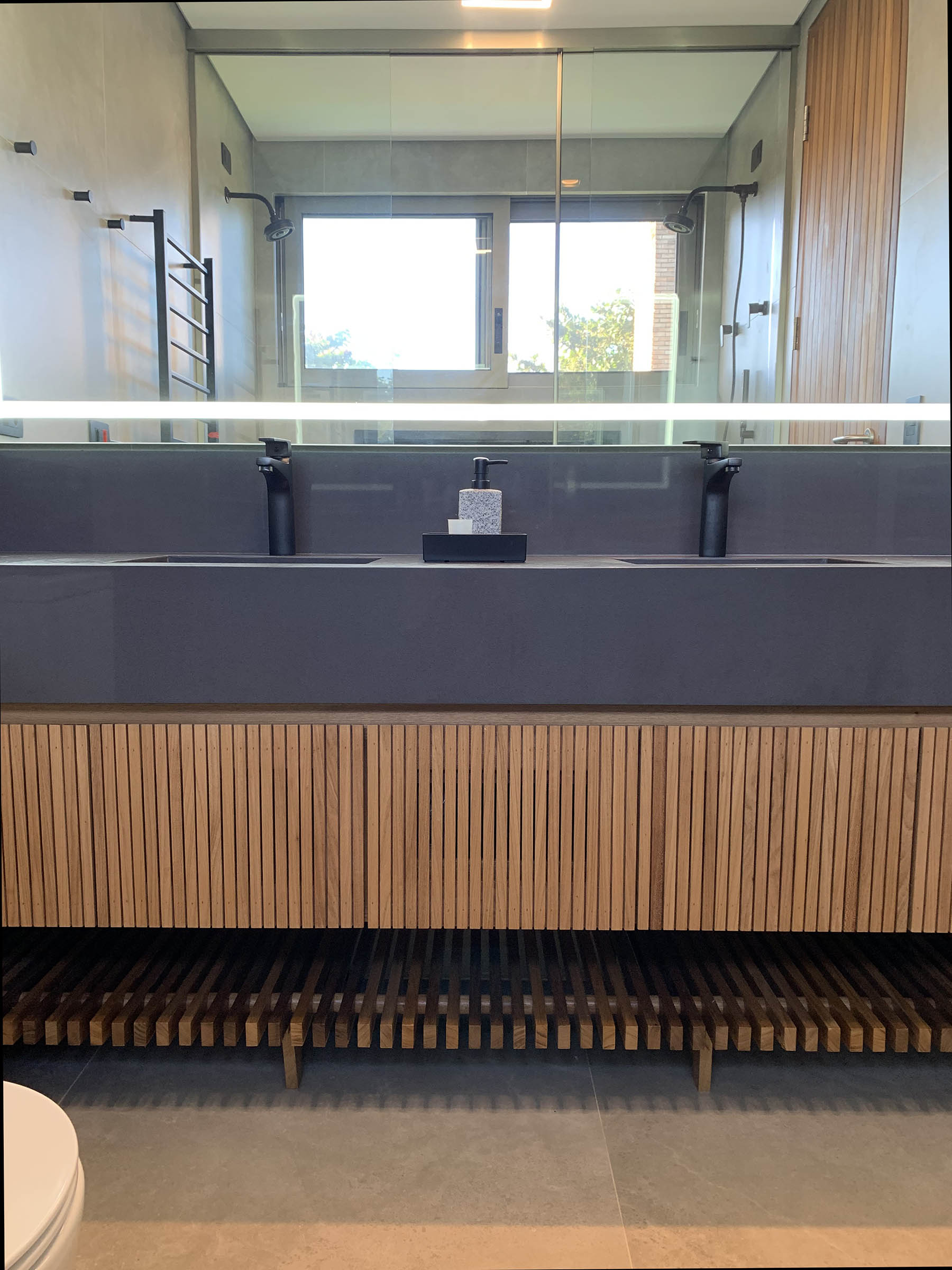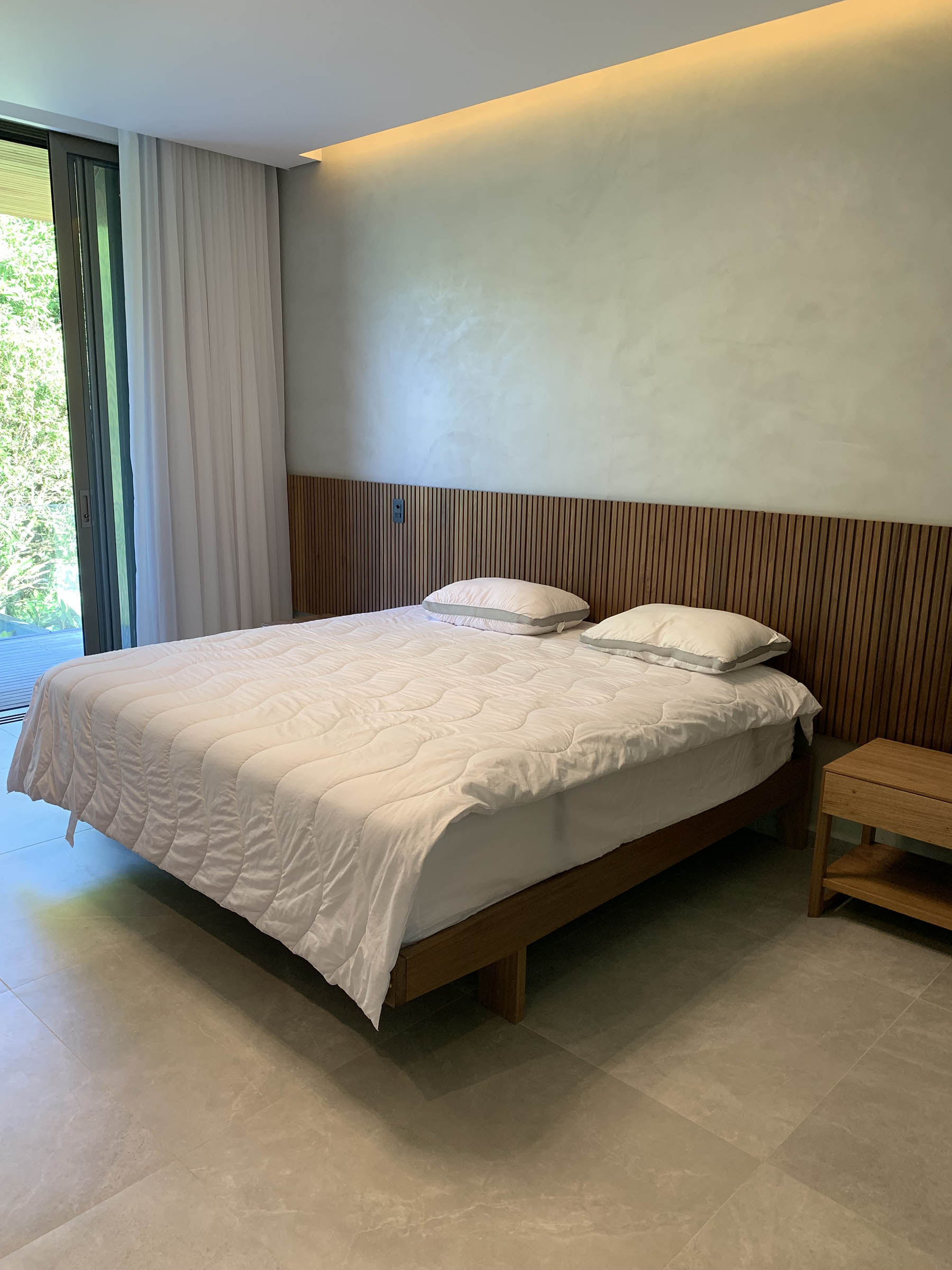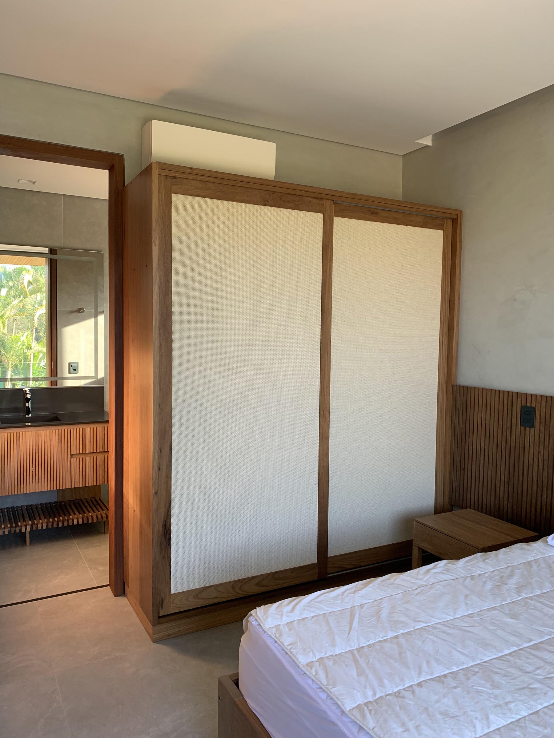 Um recurso técnico e estético relevante é a modulação da porta, habilmente ocultada por um ripado em madeira natural. Essa solução, além de agregar valor estético, atua como uma medida preventiva contra a umidade local, garantindo a durabilidade e a funcionalidade do ambiente em um contexto de praia.
