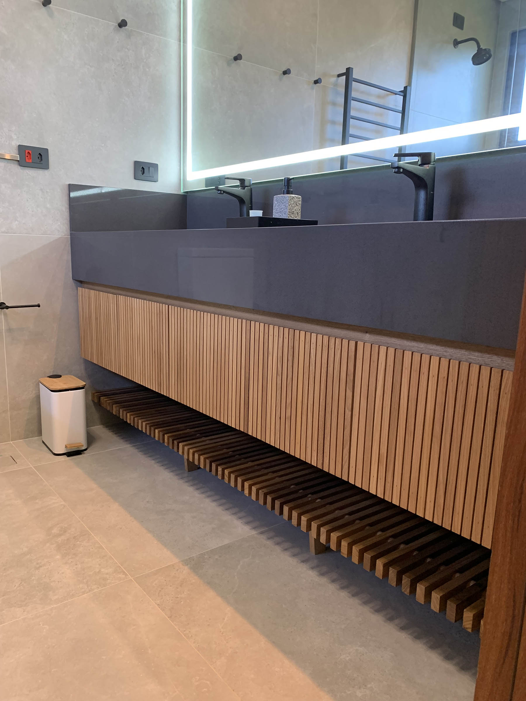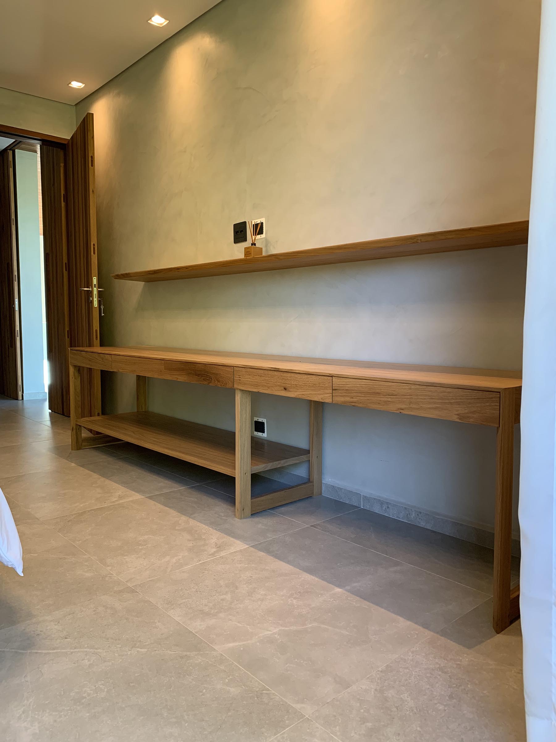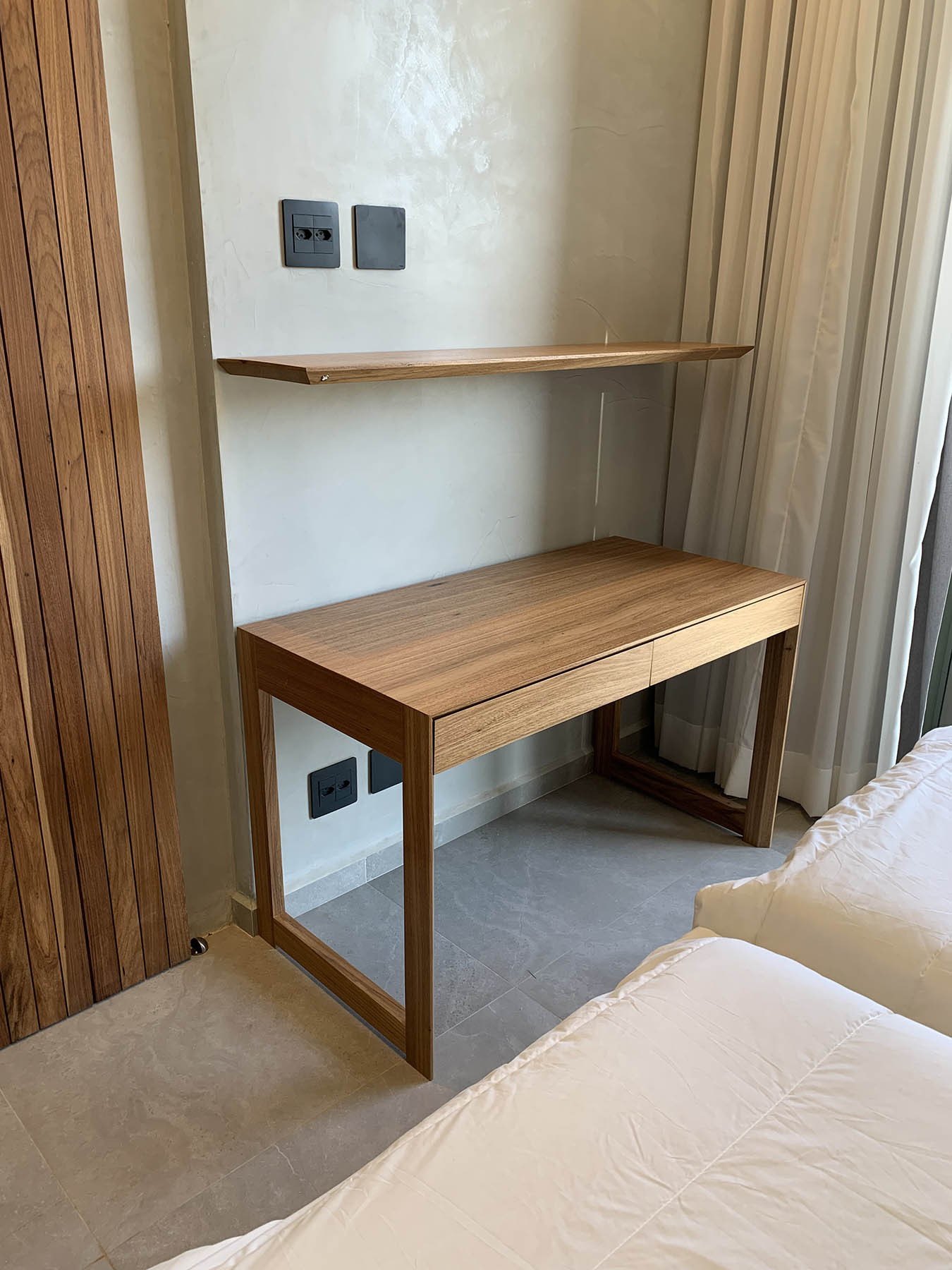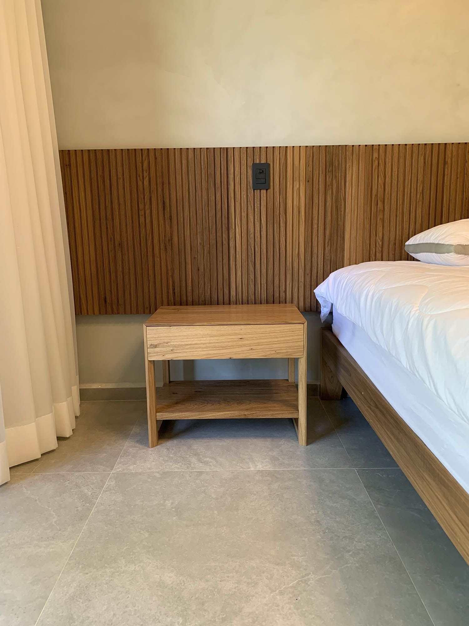 O elemento central é a marcenaria em madeira natural, que se impõe com proporções elegantes e um design limpo e linear. Sua presença não só confere sofisticação aos espaços, mas também estabelece um elo com a natureza circundante.